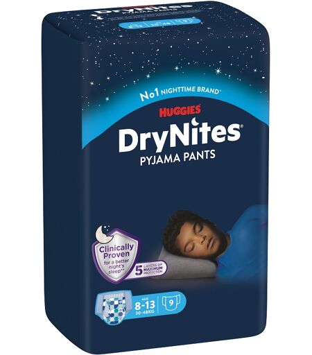 DryNites - Mutandine assorbenti taglia L (8-15 anni/27-57 kg), di aiuto ai ragazzini chehanno problemi di pipì a letto. Offrono protezione per tutta la notte grazie aduno strato sottile superassorbente che allontana il bagnato dalla pelle, alle barriereantifuoriuscite e ad un rivestimento esterno i… ...