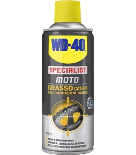 WD40 Grasso Catena Moto per condizioni umide Il Informazioni principali del prodotto Assicura una maggiore durata della catena e delle sue parti Non schizza grazie alle eccezionali proprietà anti-schizzo Anticorrosivo Garantisce la performance delle catena Asciuga rapidamente raccomandato per Catene, trasmissioni, anelli O,X,e Z ...