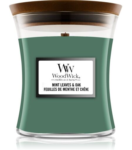 Woodwick Mint Leaves & Oak candela profumata con stoppino in legno 275 g