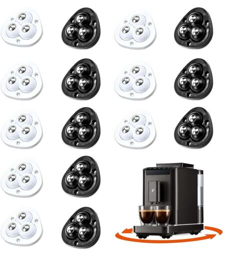 【16 Ruote girevoli universali a 360°】Riceverai 16 ruote autoadesive per mobili (8 nere e 8 bianche), dimensioni: 47x47x15 mm. Due colori diversi, che puoi scegliere per applicarle a diversi elettrodomestici e mobili in legno. Sono realizzate in plastica resistente e le tre solide sfere in acciaio offrono un supporto robusto e una struttura solida, non facili da usurare e arrugginire, resistenti e durevoli. 【Nessun rumore】Desideri attenuare il rumore fastidioso quando trascini oggetti? Vuoi rendere più facile lo spostamento di piccoli elettrodomestici? Temi di danneggiare il pavimento quando trascini oggetti? Con queste mini ruote, il trascinamento è silenzioso e molto facile, sono silenziose e sicure, il che le rende ideali per contenitori da cucina, bidoni della spazzatura o piccoli mobili - molto pratiche e funzionali! 【Rotazione a 360°】Le mini ruote per mobili presentano un design unico con 3 sfere in acciaio che consentono una rotazione di 360 gradi, consentendo uno scorrimento ...