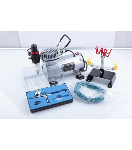 AS18-2 kit compressore aerografo completo di AB-130 pistola Il kit Airbursh di altissima qualità, che circonda il potente compressore a pistoni senza olio, offre a tutti i principianti ciò di cui hanno bisogno. La pistola aerografa a doppia azione contenuta nel kit si presta in particolar modo alla nebulizzazione su grandi superfici. Grazie alla pompa a raccordi rapidi e al pratico supporto, questo kit è un insieme ideale per tutti i principianti. Dati tecnici Mini compressore AS18-2 (con manometro, regolatore di pressione) Modello: Compressore a pistone, senza olio Potenza: 150W Velocità di rotazione: 1450/1700g/min Portata dell'aria: 23l/min Colore: grigio argentato Regolazione di pressione: 0-4bar Aggiustamento di regolazione: funzione: 2 bar, arresto automatico: 4bar Pressione reale di servizio in funzione continua: circa 2.5bar con condotto da 0.2, circa 1.7bar con condotto da 0.5mm Pressione massima: 4bar Raccordo pompa: 1/8'' Lunghezza cavo: 1.9m Dimensioni: 240x135x210mm Peso: ...