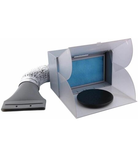 Il nostro kit completo cabina di verniciatura può evitare la diffusione delle vaporizzazioni causate dal tuo aerografo. Può anche essere utilizzato per aspirare i fumi durante la saldatura, i fumi acri e i vapori di solventi. Un ventilatore potente e silenzioso fissato sul retro produce una forte aspirazione nella cabina. Questo permette un'aspirazione su tutta la superficie del filtro. Il rumore indotto si riduce al massimo con solo 52 dB. Le parti in plastica permettono l'apertura e la chiusura rapida. È progettato per permettere una pulizia facile e una lunga vita Il piatto girevole inclusa consente di lavorare facilmente e comodamente. La maniglia dell'apparecchio permette un trasporto facile. Il condotto d'evacuazione d'aria può facilmente incastrarsi in una finestra o porta, o essere utilizzato per evacuare i gas all'esterno attraverso una perforazione in una parete o un muro. Dati tecnici: Potenza: 25 W Tensione: 230 V Volume d'aria: 3m³/min. Rumore: 52 dB Diametro del piatto: ...