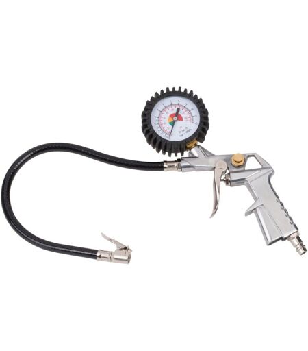 Informazioni tecniche: Pressione dell'aria: 6 bar Graduazioni: da 0 a 12 bar Diametro della connessione di ingresso dell'aria: 0,25" Lunghezza flessibile: 44 cm Materiale flessibile: PVC Materiale dell'impugnatura: Lega di alluminio ...