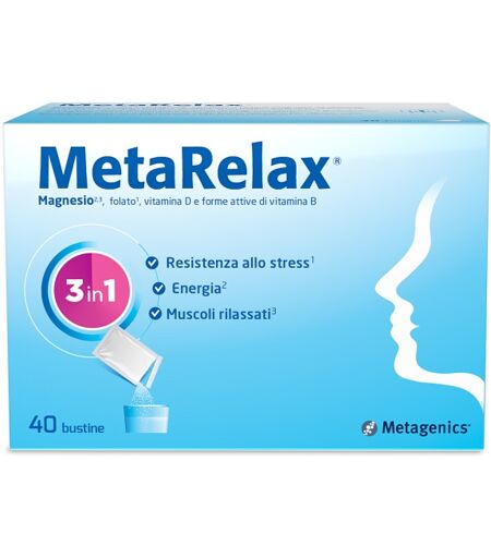 MetaRelax - Descrizione Integratore alimentare a base di vitamine, magnesio e taurina, in bustine monodose. È una formulazione completa a base di magnesio da utilizzare in situazioni di stress (acido folico), di stanchezza (acido folico, magnesio, vit. B6, B12) e in caso di affaticamento muscolare … ...