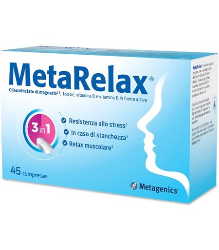 MetaRelax - Descrizione Integratore alimentare di vitamine, magnesio, e taurina. È una formulazione completa a base di magnesio da utilizzare in situazioni di stress (acido folico), di stanchezza (acido folico, magnesio, vit. B6, B12) e in caso di affaticamento muscolare (magnesio, vit D). È dimost… ...