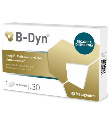 Gli integratori non sostituiscono un’alimentazione equilibrata e variegata e uno stile di vita sano. B-Dyn® contiene 7 vitamine del gruppo B nella forma attiva, ben assorbibile dall'organismo. B-Dyn® grazie alla sua composizione, contribuisce al fisiologico funzionamento del sistema nervoso e alla normale funzione psicologica (vit. B1, B3, B6, B12, biotina). Inoltre contribuisce alla riduzione di stanchezza e affaticamento (vit. B2, B3, B5, B12) e al normale metabolismo dell'omocisteina (folato, vit.B6, B12, colina). Ingredienti: Agente di carica: cellulosa microcristallina, bitartrato di colina, maltodestrine. Agente di carica: idrossipropilcellulosa. Agente antiagglomerante: acido stearico, niacinamide, inositolo, acido paraminobenzoico. Agenti antiagglomeranti: carbossimetilcellulosa di sodio e biossido di silicio, pantotenato di calcio. Agente antiagglomerante: sale di magnesio degli acidi grassi, piridossal-5-fosfato, riboflavina-5- fosfato, sodio, tiamina cloridrato, metilcobalamina, L-metilfolato di calcio, biotina. Senza glutine, lattosio e soia. Informazioni nutrizionali Per compressa %Ar* Vitamina B1 4,2 mg 382%* Vitamina B2 4,8 mg 343%* Vitamina B3 54 mg 338%* Vitamina B5 18 mg 300%* Vitamina B6 6 mg 429%* Vitamina B12 500 µg 20000%* Folato/Vit. B9 (Metafolin) 400 µg 200%* Biotina 450 µg 900%* Colina 82,5 mg Inositolo 50 mg Paba 50 mg *%Ar: Assunzioni di Riferimento. Modo d'uso: Assumere 1 compressa al giorno. Avvertenze: Non superare la dose giornaliera raccomandata. Tenere fuori dalla portata dei bambini al di sotto dei 3 anni di età. Conservazione: Conservare in luogo fresco ed asciutto al riparo dalla luce, dalle fonti di calore localizzate e dai raggi solari ed evitare il contatto con l’acqua. Contenuto netto: 30 compresse Produttore: Metagenics Belgium bvba Edward Vlietinckstraat, 20 8400, Oostende Belgio ...