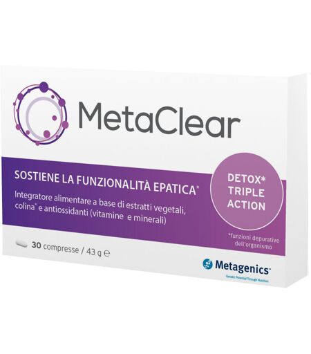 METACLEAR - Descrizione Integratore alimentare a base di estratti vegetali, colina e antiossidanti (Vitamina E, Vitamina C, Selenio). - Ingredienti L - glicina, agente di carica: idrossipropilcellulosa, citrato di potassio, bitartrato di colina, agenti di carica: cellulosa microcristallina e fosfat… ...