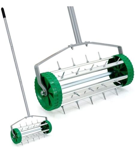 Rullo arieggiatore - Arieggiatore manuale per giardino e prato. Questo prodotto vi permetterà di avere un prato verde e vigoroso. Dopo aver utilizzato questo rullo aeratore, l'erba crescerà più densamente. Creando numerose perforazioni nel terreno (fino a 150 fori per m²), questo aeratore faciliterà l'assorbimento dell'acqua piovana e dei suoi nutrienti alle radici. Può anche essere utilizzato per preparare il terreno per la semina del futuro prato. Molto facile da maneggiare e da far rotolare, questo prodotto è facilmente smontabile per uno stoccaggio ottimale. Dati tecnici Materiale: denti in acciaio zincato, manico in alluminio e ruote in plastica. Dimensioni dell'aeratore: Altezza totale: 148,5 cm Larghezza totale (testa + attacchi laterali): 45,5 cm Manico: 125 cm Diametro del rullo: 15 cm Larghezza delle ruote alle estremità: 3,7 cm Lunghezza di ogni dente: 3 cm 27 denti: 3 barre da 5 denti e 3 barre da 4 denti Colore: grigio alluminio e verde Dimensioni della scatola: 45 x 25 x ...