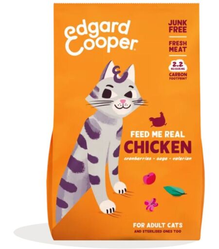 Edgard & Cooper Alimento Secco Grain Free Pollo Fresco per Gatti Adulti. Le nostre crocchette al pollo allevato all’aperto sono complete e senza schifezze, perfette per tutti i gatti adulti, anche sterilizzati. Preparate solo con tanta carne fresca, che non è stata ridotta in polvere, stracotta o sfilacciata e con una selezione di ingredienti tra i più gustosi. Il cibo vero ha un gusto genuino ed è più salutare per il tuo gatto. Per questo nelle nostre crocchette abbiamo messo tanta carne fresca che aiuta a mantenere i muscoli forti e l’olio di salmone, che contribuisce ad avere un pelo morbido e lucido. C'è anche la taurina, benefica per gli occhi e il cuore del tuo gatto, e la L-carnitina per favorire un metabolismo sano. Senza cereali e facile da digerire sono il segreto per gatti felici. Non c’è traccia di additivi artificiali né di zuccheri aggiunti. Solo una manciata di erbe e bacche offerte da madre natura: mirtilli rossi, salvia e valeriana. Semplicemente...Mmmmiao. Disponibile in 2 formati: 325g - 2kg. COMPOSIZIONE: .pollo allevato all’aperto fresco 50% .piselli, patate (disidratate) .amido di patate .proteina di patate .proteina di piselli .minerali .sughetto di pollo .grasso di pollo .semi di lino .lieviti (essiccati, fonte naturale di mannanoligosaccaridi (MOS) e beta-glucani) 1,5% .cicoria (essiccata, fonte naturale di fruttoligosaccaridi (FOS) e inulina) 1% .barbabietola (essiccata) .olio di salmone 0,5% .mirtilli rossi (essiccati) 0,003% .salvia (essiccata) 0,003% .valeriana (essiccata) 0,003% COMPONENTI ANALITICI: .proteina grezza 30% .grassi grezzi 17% .fibra grezza 2,5% .ceneri grezze 7,5% .umidità 6% .omega 6 3,1% .omega 3 0,9% .calcio 1,1% .fosforo 0,9% ADDITIVI NUTRIZIONALI (AL KG): .vitamina A 20.000 UI .vitamina D3 1.750 UI .vitamina E 250 mg .zinco (solfato di zinco monoidrato) 100 mg .ferro (solfato di ferro (II) monoidrato) 70 mg .iodio (iodato di calcio anidro) 1,5 mg .rame (solfato di rame(II) pentaidrato) 10 mg .manganese (solfato manganoso monoidrato) 30 mg .taurina 1.500 mg .DL-metionina 3.000 mg .L-carnitina 100 mg SOMMINISTRAZIONE: DOSE GIORNALIERA CROCCHETTE. PESO GATTO (KG) STERILIZZATO-CASALINGO OUTDOOR1-225g35g3-445g60g5-660g80g7-875g95g DOSE GIORNALIERA CROCCHETTE+UMIDO. PESO GATTO (KG) STERILIZZATO-CASALINGO OUTDOOR1-25g+85g15g+85g3-420g+85g40g+85g5-640g+85g60g+85g7-855g+85g75g+85g Passa al cibo senza schifezze aumentando gradualmente il prodotto Edgard & Cooper e diminuendo proporzionalmente quello precedente nell’arco di 10 giorni. ...