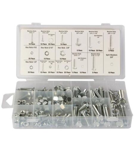 This 240-piece nut and bolt assortment includes a variety of long machine bolts, hex nuts, and split washers in popular sizes to handle a wide variety of projects. The set comes in a PVC storage case for easy portability so you'll always have the right nut or bolt for the job. Keep your fasteners organized and close at hand with this useful assortment. Informazioni sul prodotto Primärfarben Grau,Tiefe des Produkts 3 cm,Höhe des Produkts 23 cm,Breite des Produkts 11 cm,Gewicht Produkt 840 g,Material Stahl Proprietà fisiche Anzahl der Stücke 240,Aufbewahrungsboxen Ja Dimensioni dell'imballaggio 1 ...