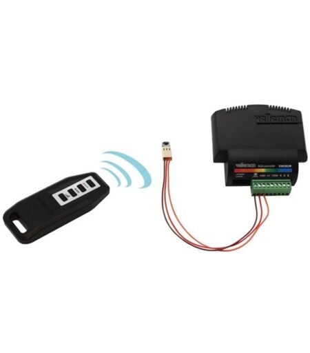 VM192IR is an infrared remote controlled RGB driver for 12 or 24 VDC LED strips. It allows you to set a colour manually or loop through all colours automatically, with 4 selectable fading speeds. A built-in dimmer allows the user to adjust the intensity, regardless of the chosen colour or mode. Informazioni sul prodotto Sprachen der Gebrauchsanweisung Niederländisch, Englisch, Französisch, Deutsch, Spanisch,Primärfarben Schwarz,Tiefe des Produkts 13.5 cm,Höhe des Produkts 3 cm,Breite des Produkts 15.5 cm,Gewicht Produkt 113 g,Material ABS Dati tecnici Spezifikationen kits & modules Strom: 2,5 A/Kanal max. (30 W / 12 V, 60 W / 24 V max.) Farbschleifenzeit (R->G->B->R): 50 s, 1 min 40 s, 2 min 30 s, oder 3 min 20 s Alimentazione Nennspannung der Batterie 12 V,Batterien inklusive Sender Ja,Eingangsspannung VDC 1 12 V,Zulässige Eingangsspannung VDC 2 24 V,Batterietyp Sender A23 (8LR932 ,1811A, 3LR50, 8LR23, 8LR932, AS23S, E23A, GP12A, GP23, GP23A, K23A, L1018, ...