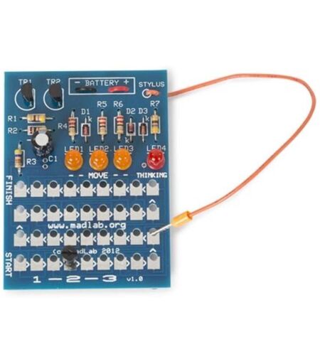 1-2-3 is a game of logic that pits you against the machine. The game's "logical thinking" is hardwired without using a microcontroller. It's all diodes, transistors and LEDs. Easy to play. Not so easy to win. You play by moving a peg along a path of holes. Players move alternately, and on each turn a player can move the peg 1, 2 or 3 spaces (hence the name). The player who moves the peg to the final hole is the winner. Informazioni sul prodotto Sprachen der Gebrauchsanweisung Englisch,Primärfarben Blau,Tiefe des Produkts 5 cm,Höhe des Produkts 1.6 cm,Breite des Produkts 7 cm,Gewicht Produkt 58 g Alimentazione inklusive Batterien Nein,Erforderliche Batterie Ja,Anzahl der Batterien 1,Batteriebetrieben Ja,Zusammensetzung der Batterie Alkali-Mangan,Batterie IEC-Größe 9 V Proprietà fisiche Anzahl der LEDs 4,Montage erforderlich Ja Proprietà d'uso Niveau der Codierkenntnisse keine,Elektronik-Kenntnisse keine,Mechanische Fähigkeiten keine,Fertigkeiten im Löten keine Dimensioni ...