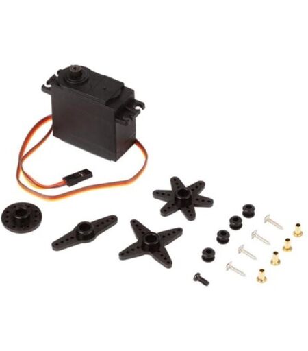 The Whadda MG995 servo motor is a high-speed, metal gear servo motor. It can be used with most standard RC receivers, or with your own hardware that can output the required PWM signals, such as an Arduino® compatible board. The servo comes with all of the required mounting hardware and a selection of arms suitable for a variety of applications. Informazioni sul prodotto Primärfarben Schwarz,Zusätzliche Farben Orange,Tiefe des Produkts 20 mm,Höhe des Produkts 47.2 mm,Breite des Produkts 54 mm,Gewicht Produkt 55 g Dati tecnici Spezifikationen kits & modules Spezifikationen Versorgungsspannung: 4,8 – 7,2 V DC Kallmoment: 83,4 Ncm (bei 4,8 V), 98,1 Ncm (bei 6 V) Betriebsgeschwindigkeit: 0,2 s/60°; (@ 4,8 V), 0,16 s/60° (@ 6 V) Drehwinkelbereich: 0 – 120 ° Totbandbreite: 5 µs Temperaturbereich: 0 – 55 °C Proprietà d'uso Niveau der Codierkenntnisse 2,Elektronik-Kenntnisse 1,Mechanische Fähigkeiten 2,Fertigkeiten im Löten 2 ...