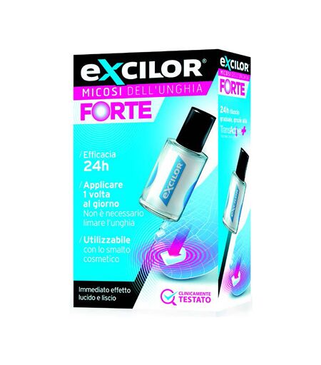 eX CILOR FORTE Descrizione Prodotto per la micosi in grado di penetrare nell'unghia in modo che venga trattata fin dall'interno. Normalmente sono necessari alcuni mesi prima che l'unghia deteriorata riacquisti un aspetto sano. L'unghia del piede cresce all'incirca 1,5 mm al mese. penetrare nell'unghia in modo che venga trattata fin dall'interno. Normalmente sono necessari alcuni mesi prima che l'unghia deteriorata riacquisti un aspetto sano. L'unghia del piede cresce all'incirca 1,5 mm al mese. Excilor Forte riduce subito il pH dell'unghia, creando un ambiente poco propizio alla proliferazione delle micosi. L'unghia rovinata deve però avere il tempo di ricrescere. Ingredienti Acqua, poliuretano, acido acetico, olio di menta piperita, gallato di ottile, polisorbato 80, acido deidroacetico, cetil acetato, alcoli acetilati della lanolina, conservanti, biotina. Modalità d'uso Applicare il prodotto 1 volta al giorno, preferibilmente dopo la doccia. Pulire l'unghia ed eliminare completamente eventuali tracce di smalto prima di utilizzarlo. Utilizzare l'applicatore per coprire interamente la superficie dell'unghia. Assicurarsi di applicare il prodotto in abbondanza. Il flacone può contenere grumi residui di pellicola secca quindi eventualmente pulire dal pennello. La presenza di grumi è normale, perché causata dal contatto con l'aria. Non ha alcuna influenza sull'efficacia o sulla qualità del prodotto. È importante consentire all'unghia di asciugarsi, dai 3 ai 5 minuti. Nella fase iniziale, il liquido avrà un colore bianco, ma mentre si asciuga si creerà una pellicola lucida e trasparente. Per in risultato ottimale, è consigliabile aspettare almeno 5 minuti prima di mettersi i calzini e/o scarpe. Dopo l'applicazione, un eventuale senso di prurito sotto l'unghia indica che il prodotto sta penetrando nell'unghia stessa. La pellicola che si forma sull'unghia è resistente all'acqua e allo stress fisico come ad esempio l'attrito. Tuttavia, se sulla punta dell'unghia alcune parti della pellicola dovessero staccarsi, ciò non impatterà sull'efficacia del prodotto. La pellicola è compatibile, quando asciutta, anche con uno smalto cosmetico. Dopo 24 ore rimuovere la pellicola finché non vi sarà più alcuna traccia sull'unghia. Si può facilitare il processo usando acqua calda. Infine, applicare nuovamente il prodotto. È fondamentale lavarsi bene le mani dopo aver rimosso la pellicola e prima di applicare di nuovo il prodotto. Per ottenere risultati ottimali, curare l'unghia per minimo tre mesi e continuare il trattamento finché l'unghia non è visibilmente sana. Assicurarsi di aver chiuso correttamente il flacone dopo ogni trattamento per evitare che il prodotto evapori. Formato Soluzione da 30 ml. ...