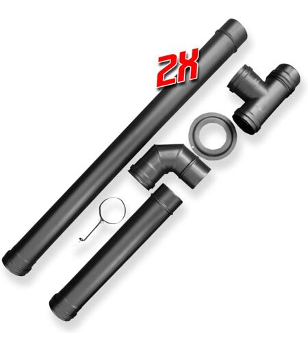 KIT DI INSTALLAZIONE PER STUFA A PELLET Materiale: acciaio verniciato nero Spessore: 1,2 mm 1 tubo diritto 50cm diametro 80mm 2 tubi diritti da 100 cm di diametro 80 mm 1 gomito a 90°, diametro 80 mm 1 raccordo a T con tappo diametro 80 mm 1 collare di sostegno del tubo, diametro 80 mm 1 rosone diametro 80 mm 1 morsetto di sicurezza con tassello 7 guarnizioni in silicone ...