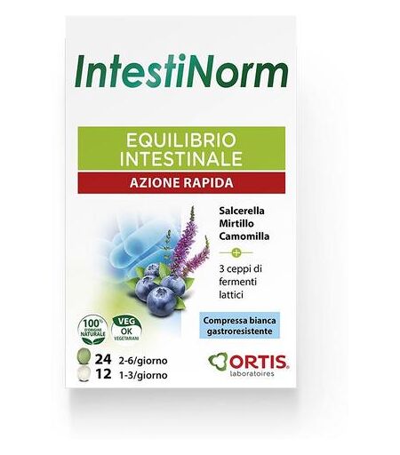 IntestiNorm è un integratore di origine 100% naturale, che con un’azione rapida favorisce l’equilibrio intestinale, normalizzando la peristalsi e regolarizzando il transito frequente. Dona benessere alla tua flora batterica.IntestiNorm è un integratore alimentare che unisce camomilla, mirtillo e salcerella alle proprietà dei fermenti lattici. Aiuta a riequilibrare la flora intestinale e a regolarizzare il transito frequente con un'azione rapida e mirata. Riduce anche il gonfiore e aiuta a mantenere normali i movimenti peristaltici e dell'intero intestino. Valori mediCompresse fermenti lattici(per 3 compresse)Cellulosa microcristallina300 mg IntestiNorm è adatto a tutti coloro che necessitano di un supporto per riequilibrare e migliorare il funzionamento del transito intestinale. È adatto anche ai vegetariani. Valori mediCompresse di piante(per 6 compresse)Salcerella e.s.1,5 gCamomilla e.s.225 gMirtillo frutti e.s.30 mg Riequilibra la flora intestinale. IntestiNorm regola il funzionamento dell'intestino e dell'intera flora batterica, grazie alle sue componenti:Camomilla: aiuta in caso di flatulenza e gonfioreLattobacilli e Bifidobatteri (3 ceppi): favoriscono l'equilibrio della flora intestinaleMirtillo rosso e Salcerella: aiutano a mantenere normali i movimenti intestinali e l'equilibrio del microbiota. Assumere 2 compresse di piante e 1 compressa di fermenti lattici fino a 3 volte al giorno secondo necessità con un grande bicchiere d'acqua.Bambini dai 6 anni: 1 compressa di piante e 1 compressa di fermenti lattici fino a 2 volte al giorno secondo necessità con un grande bicchiere d'acqua. Consultare il medico o il farmacista in caso di uso in concomitanza di trattamenti per il diabete.Non somministrare a bambini di età inferiore a 6 anni.Gravidanza e allattamento: consigliato consulto medico.Si consiglia di non superare la quantità giornaliera consigliata.Gli integratori alimentari non possono essere utilizzati come sostituti di una dieta variata ed equilibrata e di uno stile di vita sano.Tenere fuori dalla portata dei bambini piccoli.Adatto ai vegetariani. Il colore, l'odore e il gusto di questo prodotto possono variare senza comprometterne la qualità e l'efficacia. Ciò è dovuto al carattere naturale degli ingredienti. Compresse di piante: estratto secco di sommità fiorite di salcerella (Lythrum salicaria L. - 1,5 g / 6 comp.), agente di carica: cellulosa microcristallina; estratto secco di fiori di camomilla (Matricaria chamomilla L. - 225 mg / 6 comp.), estratto secco di frutti di mirtillo (Vaccinium myrtillus L. - 30 mg / 6 comp.), agenti di rivestimento: idrossipropilcellulosa, idrossipropilmetilcellulosa; agenti antiagglomeranti: magnesio stearato, talco; colorante: clorofilla.Compresse di fermenti lattici: agente di carica: cellulosa microcristallina; agente gelificante: alginato di sodio; miscela di: Bifidobacterium infantis, Lactobacillus plantarum, Lactobacillus rhamnosus, cellulosa microcristallina (300 mg / 3 comp.); agente... ...