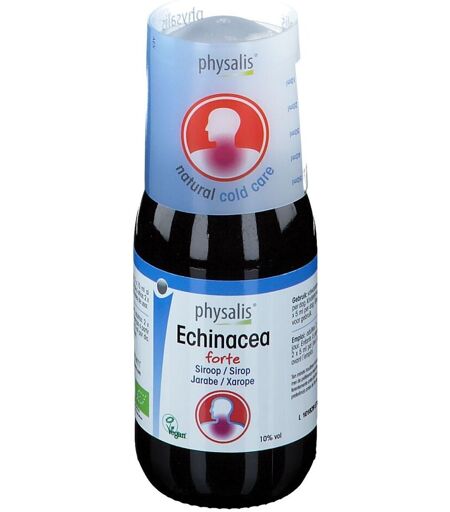 Complément alimentaire à utiliser dans le cadre d’une alimentation variée, équilibrée et d’un mode de vie sain.Physalis Echinacea forte est un sirop biologique à base d’échinacée, de sureau et de ciste. Il soutient la résistance naturelle et contribue au bon fonctionnement des voies respiratoires supérieures. Convient aux adultes et aux enfants dès 6 ans.IngrédientsSirop de blé* (Gluten), jus d’échinacée pourpre (parties aériennes fleuries)* 16 %, extrait hydroalcoolique de cistusroos* 15 %, jus de sureau* 11,1 %, infusion de fleurs de sureau* 5,5 %, jus de citron concentré*, extrait hydroalcoolique de racine d’échinacée pourpre* 4 %*Ingrédients issus de l’agriculture biologique.Allergènes : Gluten.Conseils d'utilisationAdultes : 2 x 15 ml par jour.Enfants à partir de 6 ans : 2 x 5 ml par jour.Bien agiter avant emploi.Précautions d'emploiNe pas utiliser pendant la grossesse ou l’allaitement. Ne pas dépasser la dose recommandée. Conserver au frais (max. 25 °C), au sec et à l’abri de la lumière. Tenir hors de portée des enfants.Poids net150 mlAdresse du FabricantKeyPharm & Nature’s House BVLokhorstweg 283851 SE Ermelo – Pays-Bas ...