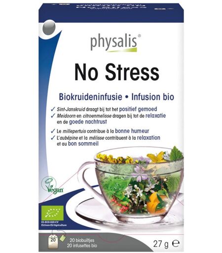 Il est important d'avoir une alimentation variée et équilibrée et un mode de vie sain. Une période de stress à la maison, au boulot ou à l’école (examens)? Déséquilibre mental? Angoisses? Physalis No Stress infusion de plantes biologiques contient du millepertuis qui contribue à la bonne humeur. L’aubépine et la mélisse contribuent à la relaxation et au bon sommeil. Au goût doux et agréable. Millepertuis contribue à la bonne humeur L’aubépine et la mélisse contribuent à la relaxation et au bon sommeil Composition: Honeybush (Buisson à miel)*, Citron* Mélise citronnelle*, Orange*, Millepertuis*, Aubépine*, Mauve sauvage*. *Agriculture biologique Conseil d'utilisation: Verser de l’eau bouillante sur l’infusette et laisser infuser pendant 5 minutes. Jusqu’à 3 tasses par jour. Précautions d'emploi: Conserver au frais (max. 25°C), au sec et à l’abri de la lumière. Poids net: 27 g = 20 infusions Fabricant: KeyPharm Siemenslaan 11 8020 Oostkamp ...