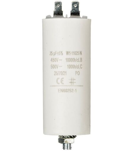 Descrizione Questo condensatore del motore (condensatore di funzionamento) viene utilizzato per generare una fase ausiliaria ed è quindi un componente importante di qualsiasi dispositivo azionato da motori elettrici. Se è difettoso, il dispositivo non è più in funzione. Per consentirvi di riparare la vostra lavatrice da soli, ad esempio, vi offriamo condensatori in varie capacità (µF) e con o senza cavo. Tensione di prova singola: tra i morsetti: 2,15 Vn per 2 sec. tra i dispositivi terminali e l‘alloggiamento: 2 KV per 2 sec. ...
