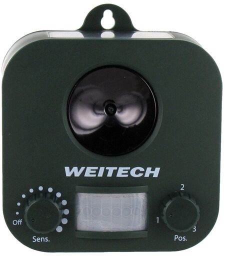 SENZA MARCA Weitech - Repellente ultrasuoni per Cani, Gatti e Volpi a batteria con ricarica solare 75 mtq