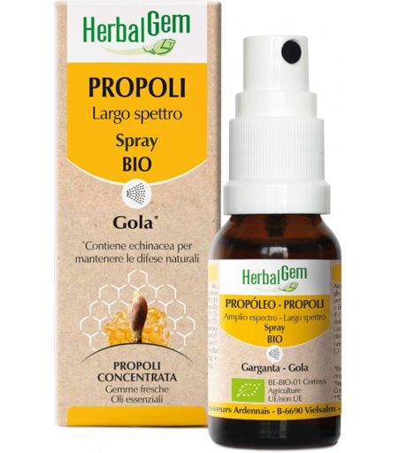 HerbalGem PROPOLI Largo spettro Spray Bio - Descrizione Integratore alimentare spray contenente echinacea per alleviare la gola. Ingredienti Alcol* (50% vol.), glicerolo*; estratti liquidi di: propoli marrone e verde* resina, echinacea* (Echinacea purpurea L. Moench) fiore, estratti liquidi di olio… ...