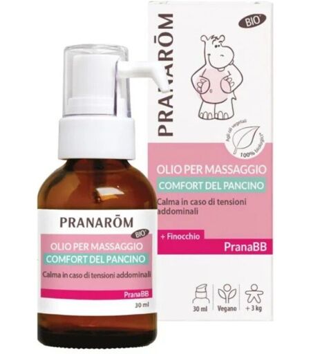 Pranarom PranaBB Olio per Massaggio Comfort del PancinoL’olio per massaggio Comfort del pancino è appositamente concepito per un massaggio reconfortante del bebé al momento della digestione: calma e riduce le tensioni addominali: arricchito con oli essenziali di Finocchio, Zenzero, Arancia dolce e Menta verde, l’olio per massaggio comfort del pancino favorisce il benessere dei più piccoli durante la digestione, mentre gli oli vegetali di cocco, mandorla dolce e girasole nutrono e proteggono la pelle sensibile del bebé.Modo d´uso:scaldare una dose di olio da massaggio nella mano e massaggiare delicatamente il pancino del bambino in senso orario. Applicare fino a 3 volte al giorno mentre si parla al bambino per rassicurarlo.IngredientiAgli oli vegetali 100% biologici* : Mandorla dolce, Vaniglia+ oli essenziali : Finocchio, Zenzero, Arancia dolce e Menta verdeProduttore: Herbalgem Italia Srl Viale del Lavoro, 19/4 37030, Colognola ai Colli, VR Italia ...