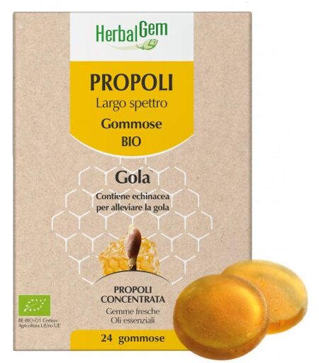 HerbalGem PROPOLI gommose - Descrizione Integratori alimentari sottoforma di gommose per il mal di gola o per le difese immunitarie indebolite. Ingredienti Agente di carica: gomma arabica*; edulcorante: sciroppo d'agave*, glicerolo*; estratti liquidi di: propoli* resina, echinacea* (Echinacea purpu… ...