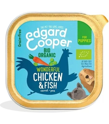 Queste vaschette per cuccioli sono realizzata con tanto pesce e pollo biologici certificati e sono ricche di proteine di qualità e omega 3. Per un pasto nutrizionalmente ancora più completo, la ricetta contiene anche gustose frattaglie nutrienti come cuore e fegato e un delizioso e nutriente mix di frutta, verdura ed erbe aromatiche bio. Gli ingredienti sono cotti a fuoco lento per conservare tutto il loro gusto e le sostanze nutritive. Tutti gli ingredienti hanno certificazione biologica che impone standard elevati per il benessere animale, come ad esempio l'accesso ad ampi spazi aperti, mentre il pesce biologico proviene da acquacultura europea, rinomata per la sua alta qualità e sostenibilità. Composizione: *Prodotto proveniente da agricoltura biologica controllata al 100%. Pollo* biologico 26%, manzo* biologico, pesce* biologico 10%, maiale* biologico, minerali, carote* biologiche 2%, piselli* biologici 2%, cinorrodi* biologici 0,1%, camomilla* biologica 0,1%. Additivi ...
