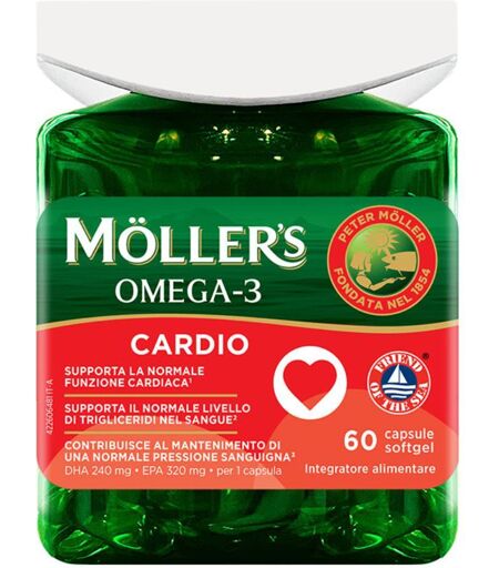 Moller's Omega 3 CARDIO - Descrizione Integratore alimentare in capsule softgel con olio di pesce concentrato ricco in acidigrassi Omega - 3 (EPA e DHA). EPA e DHA contribuiscono alla normale funzione cardiaca. L’effetto benefico si ottiene con l’assunzione giornaliera di 250 mg di EPA eDHA, pari a… ...