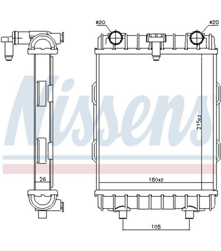 Indice: NIS 606645. Larghezza della rete [mm]: 180. Lunghezza della rete [mm]: 215. Materiale alette di raffreddamento: Alluminio. Materiale vaschetta acqua (radiatore): Plastica. Numero del Produttore: 606645. Produttore: NISSENS. Profondità della rete [mm]: 26. Tipo radiatore: Alette di raffreddamento saldate. ...