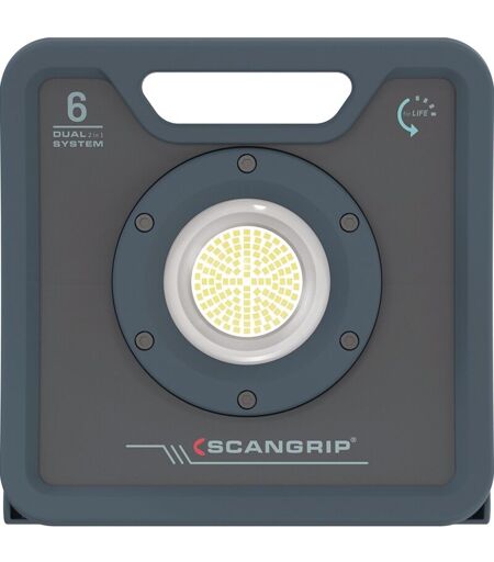 Faro da lavoro LED ricaricabile con 4000 lumen · portatile · può essere utilizzato con o senza il cavo in gomma da 5 m · impermeabile e resistente alla polvere (IP67) · dotato di manico integrato e supporto flessibile per un facile trasporto e montaggio su un treppiede SCANGRIP TRIPOD · con 90 LED · potenza luminosa regolabile · indicatori separati per il tempo rimanente e lo stato della batteria ...