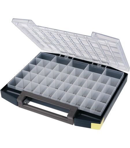 Descrizione Esecuzione: Corpo della valigetta a doppia parete in PP e coperchio in policarbonato garantiscono elevata portata e stabilità. Meccanismo di chiusura pratico per l'uso con una mano sola, maniglia con chiusura di sicurezza. I moduli profilati nel coperchio e nel fondo impediscono il rovesciamento degli scomparti intercambiabili e del contenuto durante il trasporto. Collocamento: numero di scomparti Lunghezza × Larghezza × Altezza: 40 pz. 55×39×47 mm; 5 pz. 79×55×47 mm Fornitura: Incluse 3 etichette di diversi colori per contrassegnare / identificare. Dati tecnici Tipo di prodotto Sistema di trasporto per utensili Dimensione esterna lunghezza, mm 421 Dimensione esterna larghezza, mm 361 Dimensione esterna altezza, mm 55 Numero cassette di custodia 45 ...