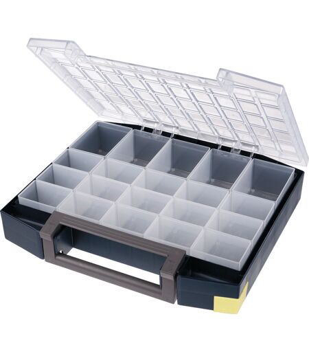 Descrizione Esecuzione: Corpo della valigetta a doppia parete in PP e coperchio in policarbonato garantiscono elevata portata e stabilità. Meccanismo di chiusura pratico per l'uso con una mano sola, maniglia con chiusura di sicurezza. I moduli profilati nel coperchio e nel fondo impediscono il rovesciamento degli scomparti intercambiabili e del contenuto durante il trasporto. Collocamento: numero di scomparti Lunghezza × Larghezza × Altezza: 15 pz. 79×55×69 mm; 5 pz. 109×79×69 mm Fornitura: Incluse 3 etichette di diversi colori per contrassegnare / identificare. Dati tecnici Tipo di prodotto Sistema di trasporto per utensili Dimensione esterna lunghezza, mm 421 Dimensione esterna larghezza, mm 361 Dimensione esterna altezza, mm 78 Numero cassette di custodia 20 ...