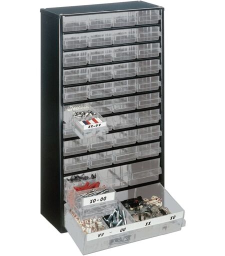 Per montaggio a parete e fissaggio nella torre rotante Art.-Nr. 400 871 595 adatto · in lamiera d'acciaio zincata · blu scuro/trasparente · cassetti in polipropilene infrangibile · con blocco di estrazione · ogni cassetto può essere suddiviso in almeno 3 scomparti · le pareti divisorie devono essere ordinate separatamente - non sono incluse nella consegna · con piedini in gomma e fori di sospensione con l'acquisto di pareti divisorie appropriate, tutti i cassetti possono essere suddivisi più volte per trovare rapidamente il contenuto, i cassetti possono essere etichettati con etichette speciali · le etichette devono essere ordinate separatamente - non sono incluse nella consegna ...
