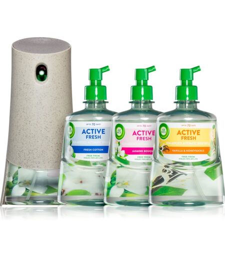 Air Wick Active Fresh, , Deodoranti per ambienti Profumo per ambienti, Profuma la tua casa o regala un bel profumo per ambienti a una persona cara. La confezione regalo Air Wick Active Fresh garantisce il successo in entrambi i casi. Un profumo per ambienti scelto correttamente evoca facilmente una sensazione di pace e tranquillità e contribuisce a creare un ambiente piacevole e accogliente. Caratteristiche: profuma splendidamente tutto il locale profumo floreale profumo fresco profumo pulito cipriato Il set contiene: deodorante automatico con ricarica 228 ml deodorante ricarica 228 ml deodorante ricarica 228 ml deodorante ricarica 228 ml Modo d’uso: Tenere fuori dalla portata dei bambini e degli animali domestici. In caso di contatto della ricarica del prodotto con la pelle, lavare immediatamente con abbondante acqua e sapone. In caso di contatto con gli occhi, sciacquare con acqua per alcuni minuti. Seguire le istruzioni allegate. ...