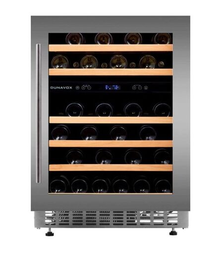 Dunavox Flow 46D, cantinetta vino sottopiano, acciaio inox, DAUF-46.145DSSDunavox Flow 46D, cantinetta frigo per vino sottobanco in acciaio inox DAUF-46.145DSS, capacità: 46 bottiglie (0,75 l Bordeaux), design interno: ripiani telescopici in legno e illuminazione interna a LED , cerniera porta reversibile ...
