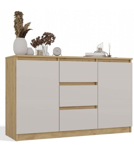 CREDENZA MODERNA 2 ANTE, 3 CASSETTI MODELLO: CAZAR Colore: Struttura: ROVERE ARTISAN Frontali: CASHMERE (Tono beige elegante e alla moda) La credenza 2D3S è un mobile elegante e funzionale, perfetto per salotto, camera da letto, ingresso o cameretta. La combinazione Rovere Artisan e Cashmere conferisce un look moderno e raffinato, che si armonizza coi più diversi stili di arredo, dal minimalista al classico. Con due ante e tre cassetti capienti, offre tanto spazio contenitivo. Le mensole interne consentono di organizzare oggetti voluminosi, mentre i cassetti sono perfetti per accessori più piccoli. CARATTERISTICHE PRINCIPALI: Design moderno e minimale – adatto a vari stili d’arredo Combinazione trendy di colori – Rovere Artisan e Cashmere Interno funzionale – mensole più 3 cassetti spaziosi per organizzare Frontali senza maniglie – elegante e comodo da usare Costruzione robusta – materiali resistenti per lunga durata Made in Poland – qualità costruttiva e cura dei dettagli MATERIALI: ...