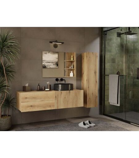 Mobile da Bagno Sospeso per Lavabo – TIGO 1D2S 1 anta • Frontale rigato • 2 cassetti Colore: Rovere Evoke Il TIGO 1D2S è un mobile da bagno elegante e funzionale, con design moderno e ottima lavorazione. Il frontale verticale rigato (imitazione lamelle) in caldo Rovere Evoke conferisce stile e carattere naturale al mobile. La combinazione di un’anta a ribalta verso il basso (con pistone a gas) e due cassetti spaziosi rende il TIGO 1D2S non solo decorativo ma soprattutto pratico, facilitando l’organizzazione quotidiana del bagno. La maniglia superiore rigata permette un’apertura comoda senza elementi aggiuntivi. Il mobile è progettato per l’installazione sotto lavabo da appoggio – lo spazio aperto per il sifone e la disposizione intelligente di cassetti e scomparti lo rendono estremamente pratico. Caratteristiche principali: Design moderno con frontale rigato Anta a ribalta verso il basso con pistone a gas 2 cassetti spaziosi con guide a sfere, estrazione totale e chiusura ammortizzata ...