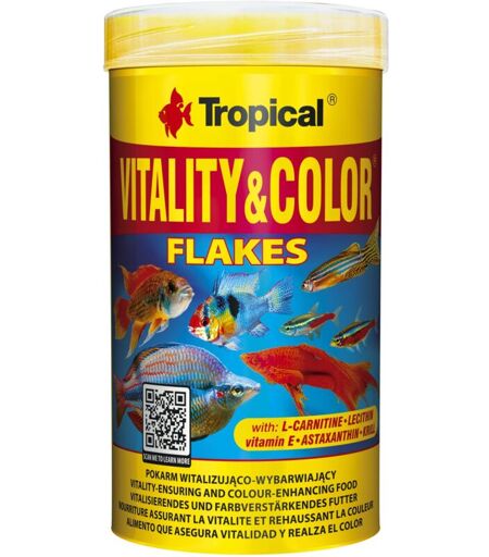 Descrizione Descrizione VITALITY & COLOR è uno speciale mangime completo in scaglie, altamente nutriente, che intensifica i colori di tutti i pesci d’acquario. La lecitina e la vitamina E contenuti stimolano la riproduzione e l’attività dei pesci. La preziosa L-carnitina favorisce la combustione dei grassi. Nel contempo, l’elevato contenuto in carotenoidi facilmente assimilabili (compresi astaxantina e beta-carotene) agisce positivamente sullo sviluppo dei colori, attivando le cellule pigmentali. Ingredienti Alimento completo per pesci ornamentali. Composizione: pesci e sottoprodotti dei pesci, cereali, uova e sottoprodotti dell’uovo, estratti di proteine vegetali, molluschi e crostacei (farina di krill 8%), lieviti, sottoprodotti di origine vegetale, alghe (Spirulina platensis 1%), oli e grassi, sostanze minerali. Additivi (per kg): Vitamine: vitamina A 42 500 U.I., vitamina D3 2 650 U.I., vitamina E 180 mg, vitamina C 320 mg, beta-carotene 145 mg, L-carnitina 220 mg. Oligoelementi: ...