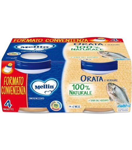 Mellin ORATA - Descrizione Alimento per la prima infanzia. Omogeneizzato con filetto di orata e verdure. Indicato a partire dal 6° mese compiuto, sentito il parere del pediatra. Senza sale aggiunto. Filetti di orata cotti con vapore. Ingredienti Acqua di cottura, verdure (23,5%)(patate, cipolle, se… ...