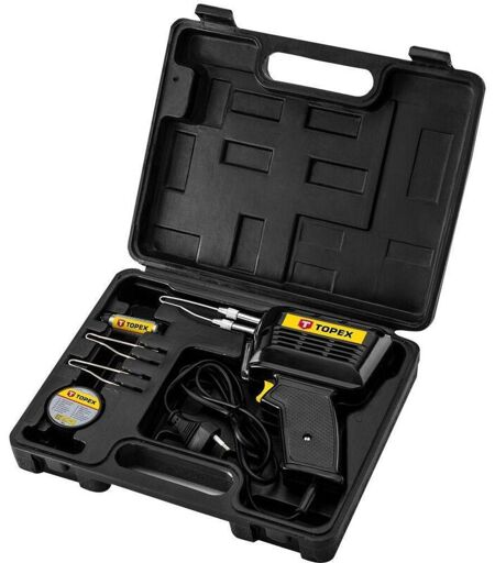 Saldatore a trasformatore TOPEX (rif. n. 44E005) con potenza di 150 W. Viene utilizzato per collegare parti metalliche utilizzando un metallo d'apporto a basso punto di fusione, come stagno-piombo per la saldatura dolce. È particolarmente utile per collegare componenti con sezioni trasversali maggiori, come impianti elettrici per autoveicoli, impianti elettrici domestici a bassa tensione e altre applicazioni che richiedono temperature di riscaldamento elevate. È dotato di una lampadina integrata che illumina il punto di saldatura, migliorando significativamente il comfort di lavoro. Viene fornito in una pratica valigetta per il trasporto e include pasta saldante e stagno per saldatura. La conformità agli standard di sicurezza europei è garantita dal certificato CE. Il marchio TOPEX è rivolto agli appassionati del fai da te. Lunghezza: 27,7 cm EAN: 5902062671509 Larghezza: 22,3 cm Peso: 1,574 kg Altezza: 6,2 centimetri ...