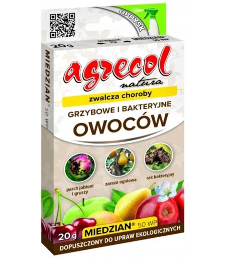 Miedzian 50 WP20 gMerits MRiMW n. R-134/2015 del 03/09/2015, modificato da ultimo dalla Decisione MRiRW n. R-1296/2023d del 12/12/2023. Miedzian 50 WP è un fungicida in polvere per la preparazione di una sospensione acquosa ad azione superficiale per uso preventivo nella protezione dalle malattie, nella coltivazione amatoriale di alberi da frutto a fusto basso e piante da orto in orti e giardini domestici. Tutti i prodotti fitosanitari per uso professionale possono essere acquistati solo da persone maggiorenni in possesso dei requisiti richiesti per l'acquisto di prodotti fitosanitari specificati nella Legge sui Prodotti Fitosanitari. Il mancato rispetto delle condizioni di cui sopra costituisce una violazione dei regolamenti del negozio. Nota! I prodotti fitosanitari devono essere utilizzati in modo sicuro. Prima di ogni utilizzo, leggere le informazioni sull'etichetta e le informazioni sul prodotto. L'Acquirente dichiara di soddisfare le condizioni specificate nell'Art. 25 comma 3 ...