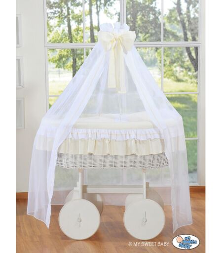 Cestino in vimini per neonati. Romantico bordo in cotone colorato e tulle bianco, con volant decorativi lungo i bordi. Il baldacchino in voile può essere utilizzato anche come zanzariera. Cestino nanna in vimini per neonati Da un'azienda rinomataMY SWEET BABY,da un produttore leader in Europa di questo tipo di ceste. Tessuti di altissima qualità, certificati Okotex e TUV. Serie Luxury - finiture in cotone colorato con doppi volant e nastri decorativi. Il baldacchino in voile può essere utilizzato anche come zanzariera. Disponibile in 3 colori: crema, rosa e blu. Un'ottima soluzione sia per piccoli appartamenti che per case. Le grandi ruote rendono il cestino facile da spostare. Questo significa che il tuo bambino è sempre con te. Può anche dormire comodamente sul balcone o in giardino: il cestino ha molto più spazio della navicella del passeggino. Il set include: - cestino in vimini bianco, - telaio in legno bianco, - 4 grandi ruote in legno con pneumatici in gomma, - rivestimento del ...