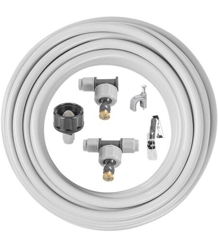 Dati tecnici Pressione massima: 6 bar Dimensioni filettatura: G3/4" (26,5 mm) Lunghezza: 15 m Tenda d'acqua 15 m Il kit tenda d'acqua può essere montato su una tettoia, una tenda da sole, un ombrellone o una pergola Gli ugelli spruzzano una nebbia che raffredda l'ambiente circostante, abbassando la temperatura fino a 11 gradi Possibilità di collegamento in serie Consumo acqua 2l/1h a 2 bar di pressione Il set comprende: 15 m di tubo, attacco con filettatura interna G 3/4” - 1, ugelli nebulizzatori – 7, ugelli stop – 1, clip – 16, gancio di montaggio – 16 ** Foto illustrative ...