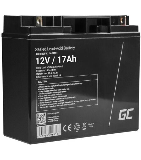 Green Cell AGM51. Tecnologia de batteria: Piombo acido sigillato (VRLA), Capacità de batteria: 17 Ah, Tensione de batteria: 12 V. Larghezza: 77 mm, Profondità: 181 mm, Altezza: 167 mm ...