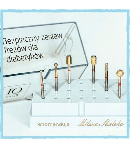 IQN Podo 4 Set Set di frese sicuro per diabetici di Milena Skalska. I pazienti diabetici spesso riscontrano problemi di guarigione delle ferite e disturbi sensoriali. Pensando a questi pazienti, è stato creato un set di frese specializzato e sicuro in collaborazione con l'esperta di podologia Milena Skalska. Il set include 6 frese e un supporto autoclavabile. 1) Punta diamantata (157TR.514.050) con un rivestimento sottile solo sulla parte superiore, grazie alla sua delicatezza, consente un controllo incredibile. La forma cilindrica e la striscia rossa la rendono ideale per lavorare delicatamente su cuticole e unghie naturali. I bordi arrotondati riducono al minimo il rischio di lesioni. 2) Punta diamantata (157SR.514.050) con un rivestimento sottile solo sui lati, grazie alla sua delicatezza, consente un controllo incredibile. La forma cilindrica arrotondata e la striscia rossa la rendono ideale per lavorare delicatamente su cuticole e unghie naturali. I bordi arrotondati riducono al ...