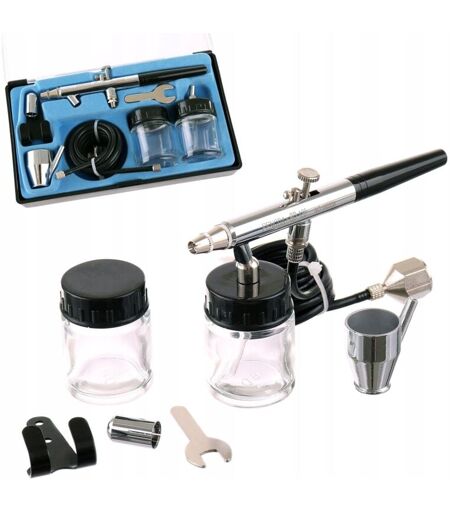 Aerografo FENGDA FEN.BD-128 originale con ugello da 0,8 mm Il set include: aerografo BD-128 , adattatore di riduzione M5x1/4" cassetta, chiave, serbatoio inferiore in metallo 1x, serbatoio inferiore in vetro 1x, gancio per appendere l'aerografo, tubo flessibile M5, serbatoio in vetro per conservare la vernice. Gli aerografi FENGDA originali, a differenza dei falsi, possono essere riconosciuti dalla scritta incisa FENGDA (R) BD-(...) Il L'aerografo BD-128 con ugello da 0,8 mm di FENGDA è caratterizzato da: Elevata precisione di verniciatura Serbatoi di vernice inferiori (facilitano la verniciatura con l'ugello rivolto verso l'alto o verso il basso) Regolazione della quantità di vernice e aria immessa (con un dito) Ago e ugello realizzati con estrema precisione Ugello da 0,8 mm utilizzato per la verniciatura superfici medie, ombreggiatura e copertura. Dati tecnici: Aerografo: FENGDA BD-128 Ugello: 0,8 mm Riduzione: M5x 1/4" (può essere collegato a un compressore di grandi dimensioni ...