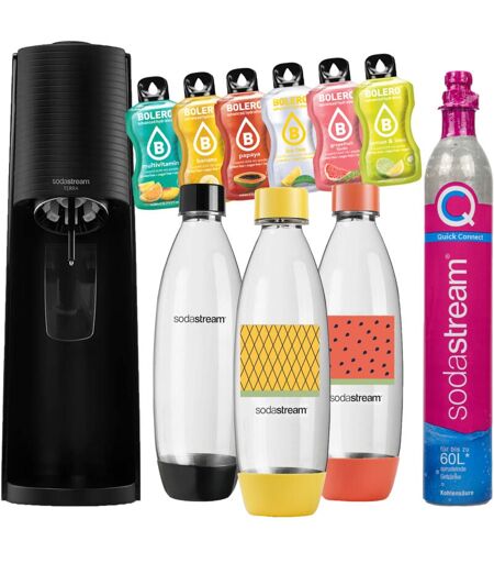 SODASTREAM TERRA BLACK saturatore + flacone fusibile NERO 1l + 2x decor + 6x Bolera