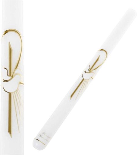 Candela per battesimo, bianca, liscia, con colomba e raggi dorati