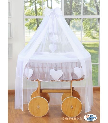 Cestino in vimini per neonati. Romantico bordo in cotone colorato e tulle bianco, con cuori decorativi. Il baldacchino in velo può essere utilizzato anche come zanzariera. Cestino in vimini per neonatiDa un'azienda rinomataMY SWEET BABY, produttore leader in Europa di questo tipo di ceste. Tessuti di altissima qualità, certificati Okotex e TUV. Romantico bordo in cotone colorato e tulle bianco, con cuori decorativi intorno al cesto e sul baldacchino. Il baldacchino in voile può essere utilizzato anche come zanzariera. Disponibile in 4 colori: bianco, crema, rosa e blu. Un'ottima soluzione sia per piccoli appartamenti che per case. Le grandi ruote rendono il cestino facile da spostare. Questo significa che il tuo bambino è sempre con te. Può anche dormire comodamente sul balcone o in giardino: il cestino ha molto più spazio della navicella del passeggino. Il set include: - cestino in vimini naturale, - telaio in legno naturale, - 4 grandi ruote in legno con pneumatici in gomma, ...